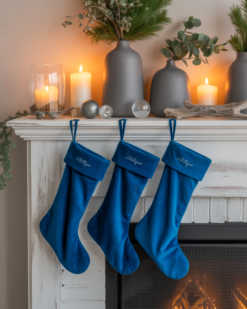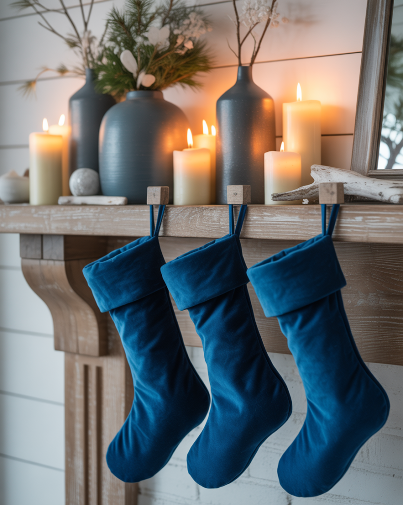 Add cool modern energy to your Christmas fireplaces with shades of blue and gray. Mix blue ceramic vases, candles, and velvet stockings for a fresh twist on classic farmhouse decor. These ideas bring coastal calm into your cozy winter space while staying elegant and timeless.