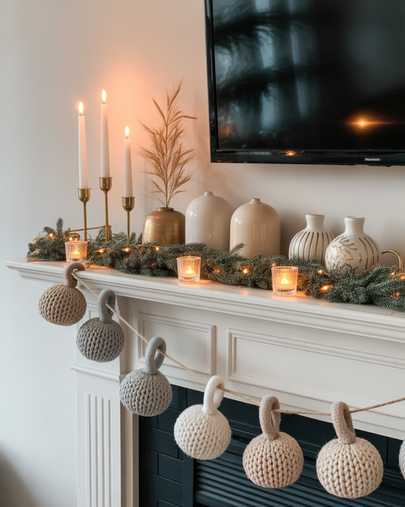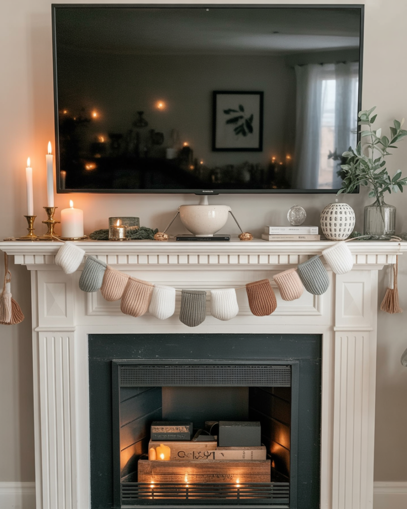 When decorating your fireplace, play with texture. Combine knit garlands, ceramic pieces, and flickering candles to make the space glow. These simple diy ideas suit both Christmas under tv setups and large mantles, adding soft depth and warmth to every cozy evening at home.