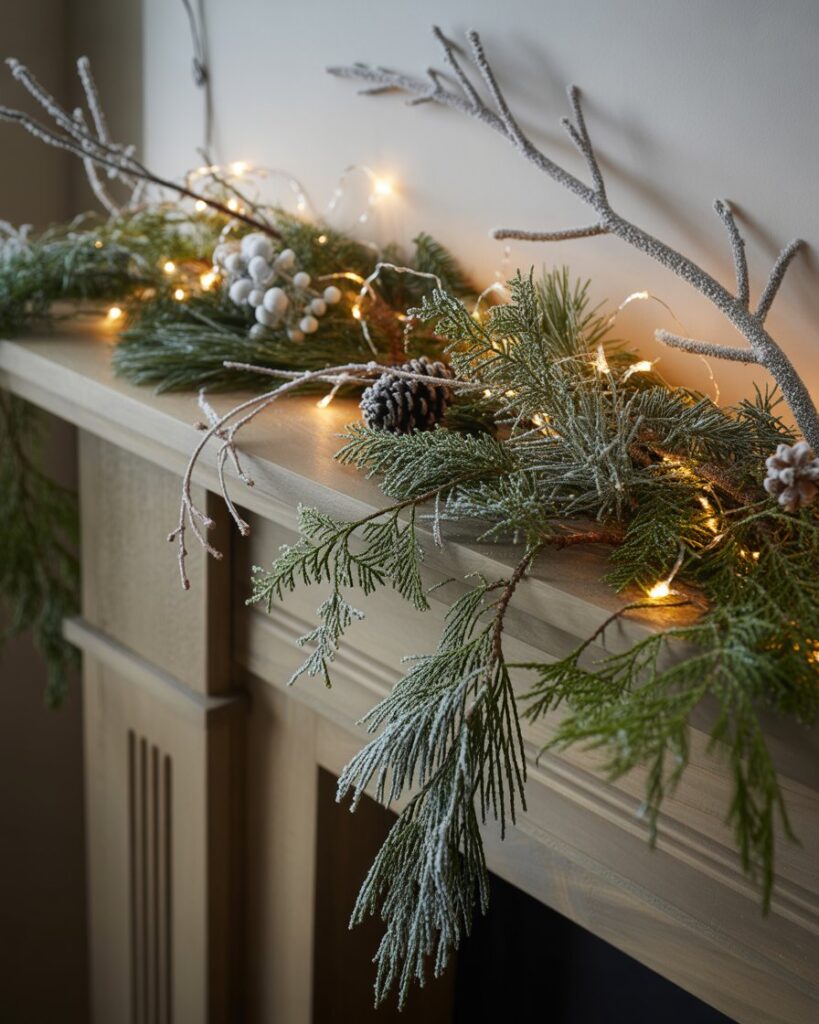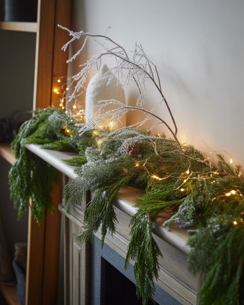 Bring in ideas yard energy with evergreen stems that extend your Christmas with lights decor. Add frosted branches, small potted pines, and subtle fairy lights to create a post Christmas sparkle. It’s a great way to keep the fireplace feeling alive through late winter without full holiday overload.