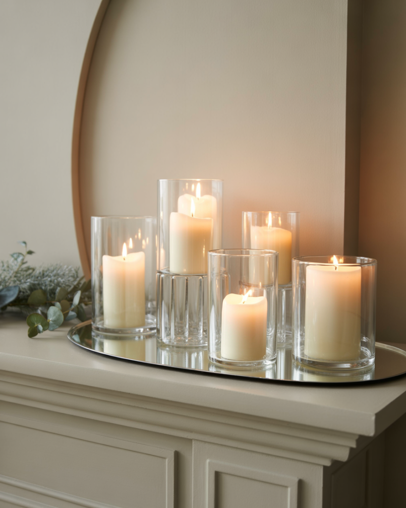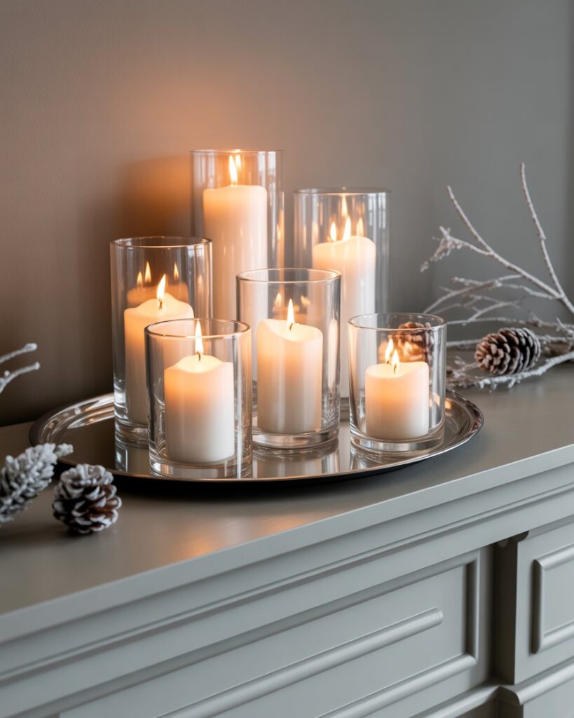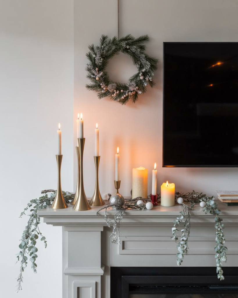 Go sleek with modern glass candleholders and transparent decor. Combine white pillar candles, reflective trays, and neutral tones for a chic Christmas mantel ideas twist. The soft reflection of light enhances the fireplace area, perfect for small spaces where brightness and openness matter.