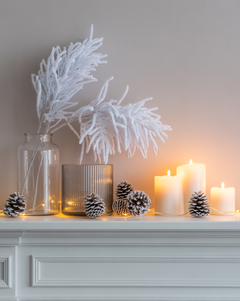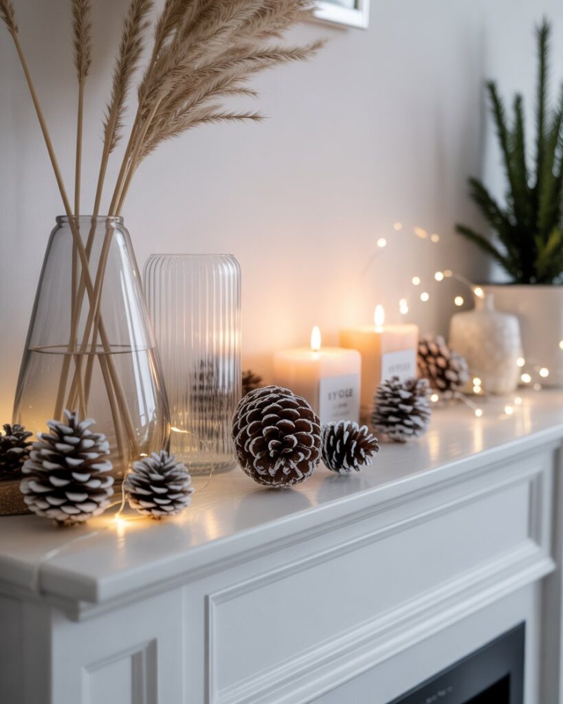 For lovers of minimalist style, a white mantle brings calm to the Christmas with lights chaos. Keep ideas simple—use clear glass vases, frosted pinecones, and small spaces greenery. The late Christmas season often calls for clean lines and breathable design, creating a fresh start for winter decor. A few fairy lights and hygge candles complete this serene setting.