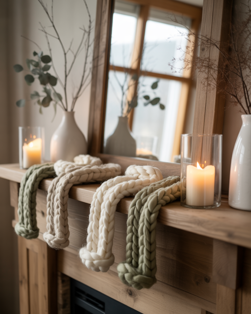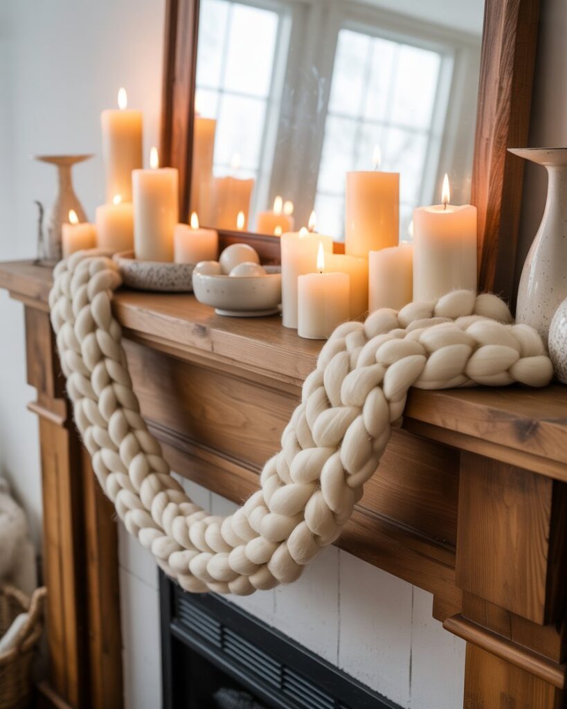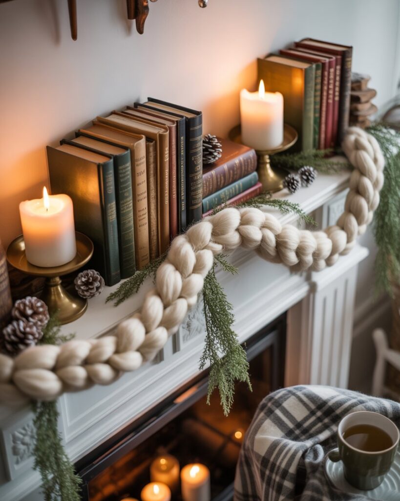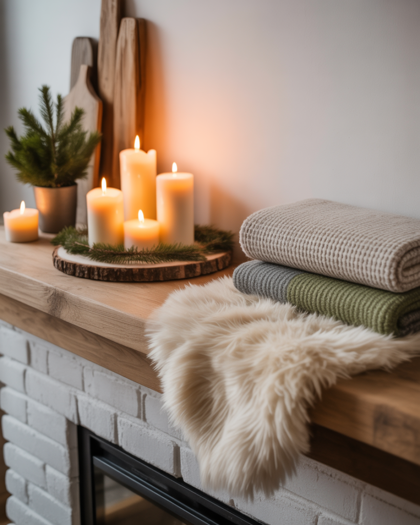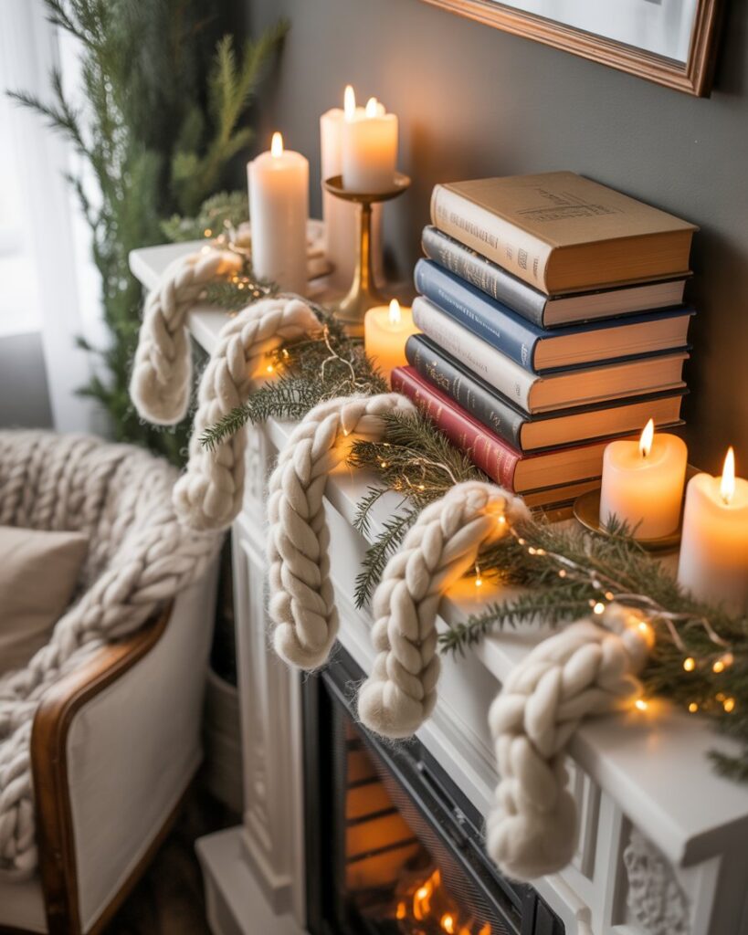 Turn your fireplace mantle into a mini hygge retreat. Add stacked books, candles, and simple diy wool garlands. This look works beautifully for post Christmas relaxation, giving you a serene corner for reading, tea, and quiet winter moments that carry warmth through January.