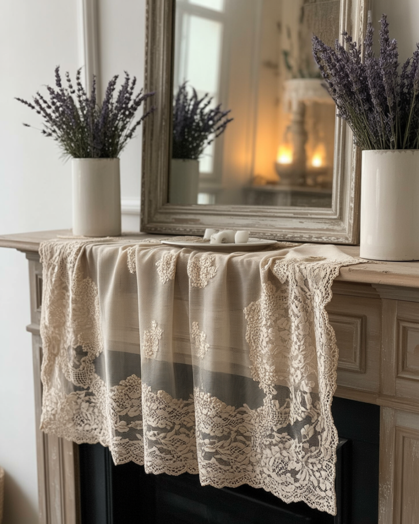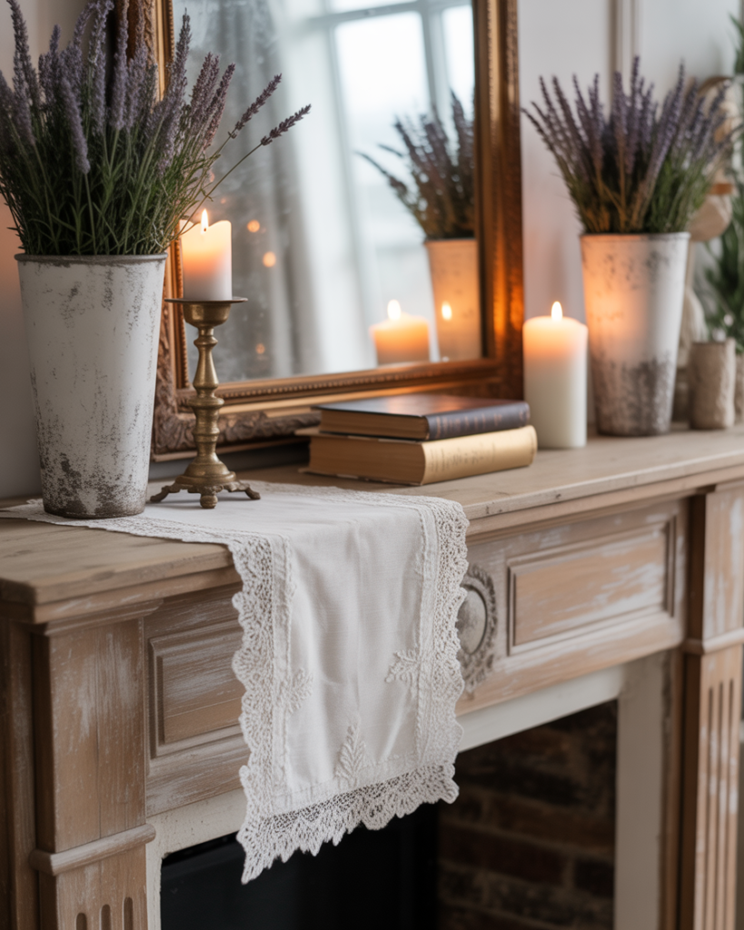 For fans of timeless charm, French country style offers romantic Christmas mantel ideas. Layer cozy lace runners, aged mirrors, and white ceramic vases filled with dried lavender or greenery. The look is both farmhouse and refined, balancing rustic textures with delicate touches that feel right through late winter.