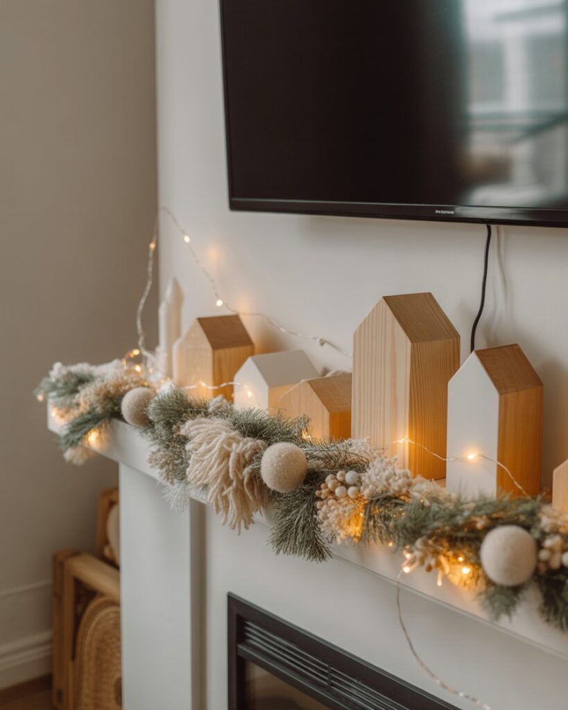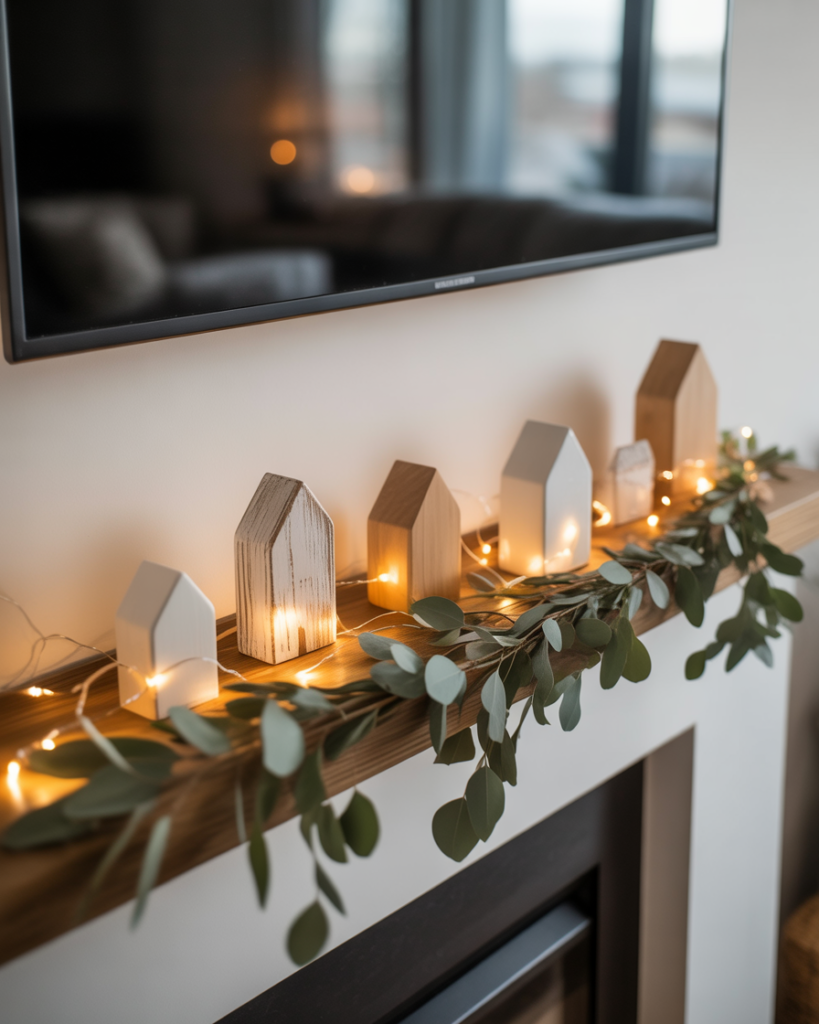 Even in small spaces, a Christmas under tv setup can look intentional and stylish. Keep ideas diy and simple, using layered greenery, fairy lights, and neutral tones to balance the tv above. Try asymmetrical garlands or small wooden houses to make your fireplace feel festive without cluttering your room.