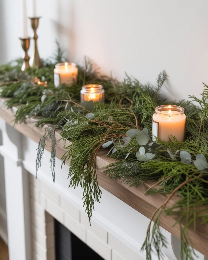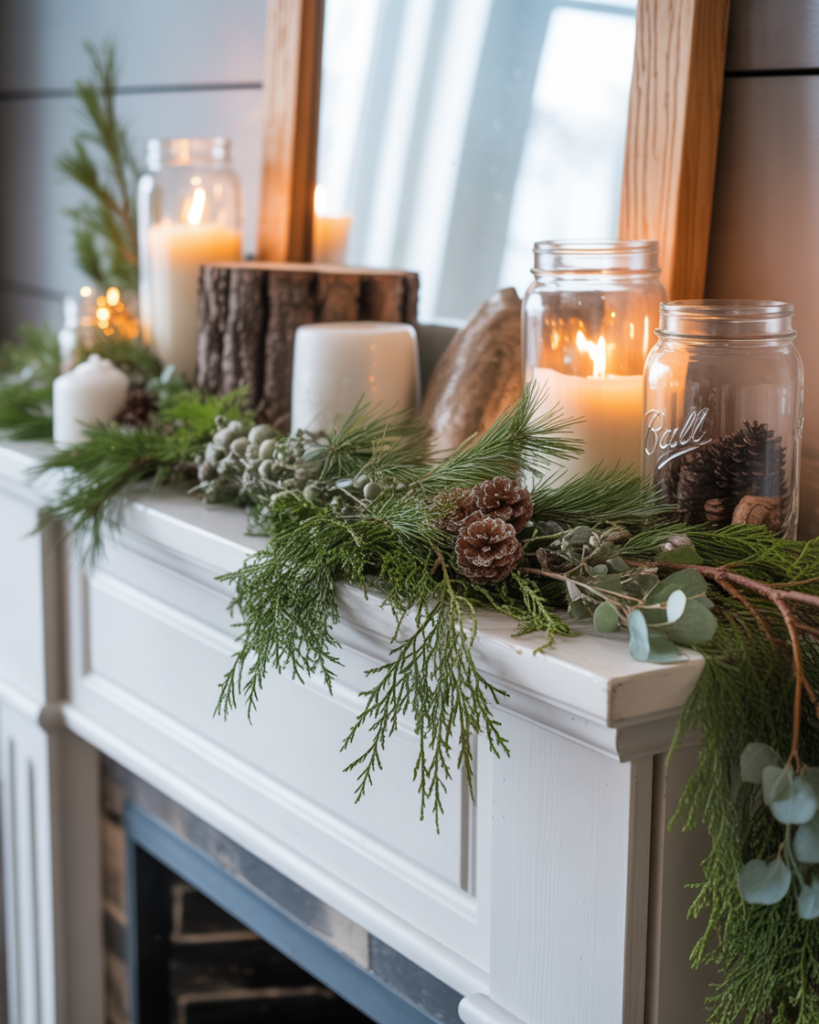 A diy winter mantle filled with evergreens can bridge fall and Christmas seamlessly. Layer fresh pine branches, cedar, and eucalyptus, adding candles in glass jars for a simple rustic glow. This look feels farmhouse but also fits modern spaces, bringing the scent and freshness of nature indoors all season.