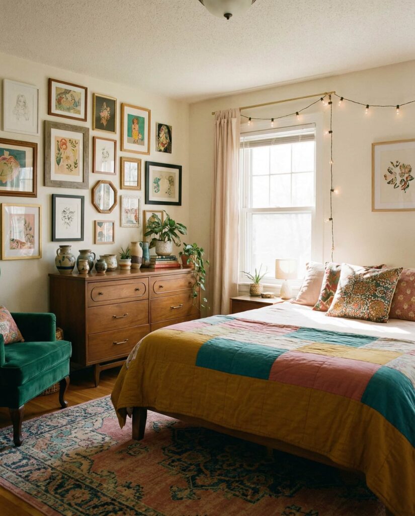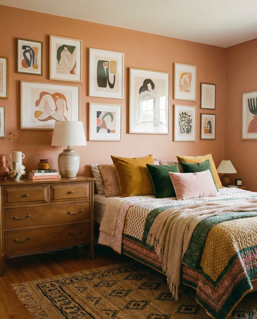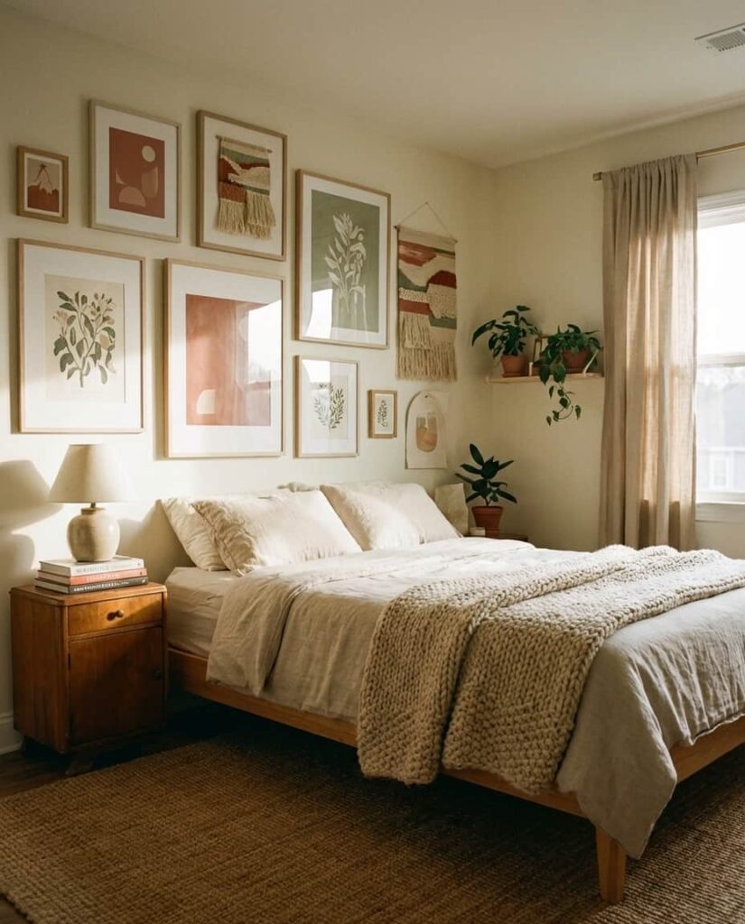 For women who collect memories visually, this idea puts wall art at the center of the room’s design. Instead of heavy furniture, the focus shifts upward, allowing art to guide color schemes and mood. I’ve seen this work especially well in rentals where furniture options are limited. The rest of the space remains simple and Cozy, letting artwork tell the story. It’s an expressive approach that feels personal without overwhelming the room.