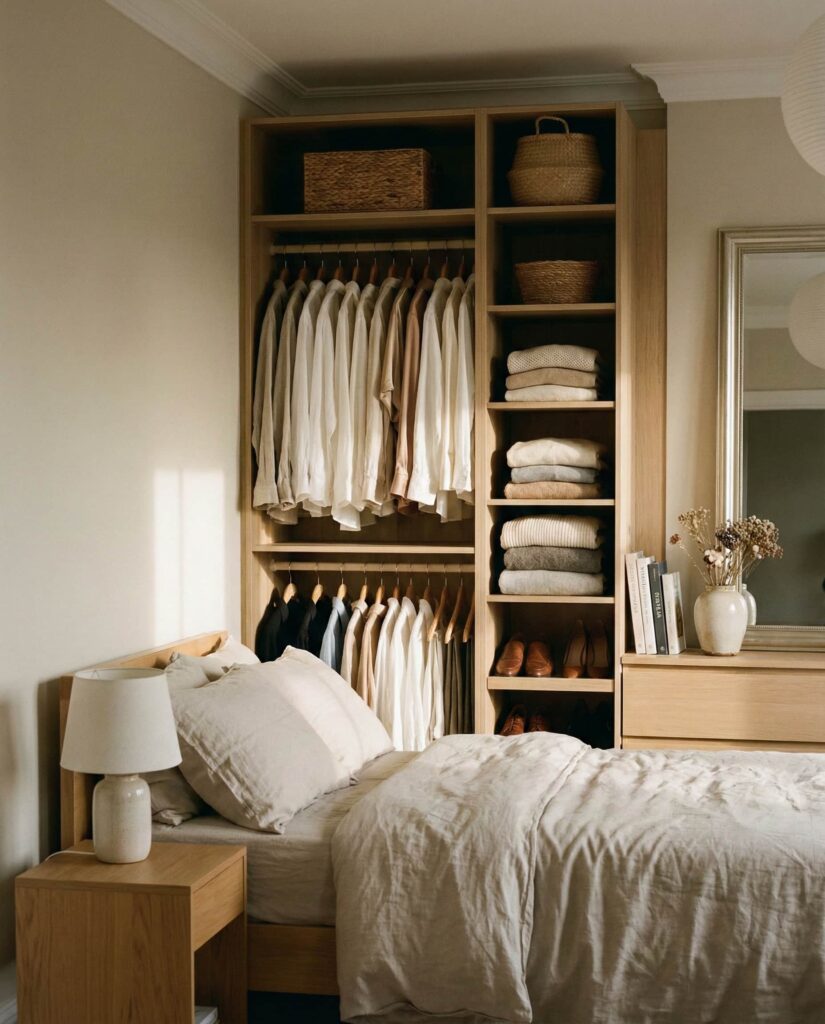 Here, wardrobe design becomes the visual anchor of the room. Open storage, curated clothing displays, and clean lines reflect a fashion-forward lifestyle. I’ve seen this idea resonate with women who treat dressing as ritual. The rest of the bedroom remains understated, allowing garments to act as living decor. This approach blends function and design seamlessly, especially in Ideas apartment settings.