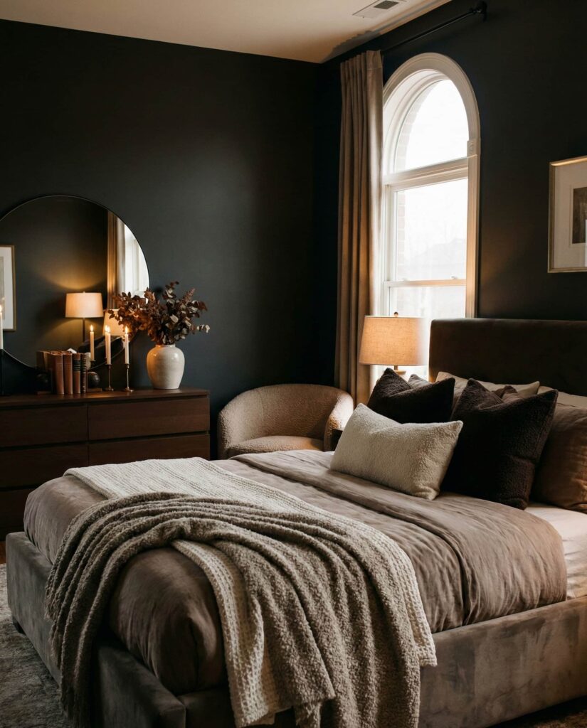 This concept explores Moody elegance through softness rather than heaviness, creating one of those ideas luxury bedrooms that feels intimate and composed. Deep neutrals, layered lighting, and plush textiles build atmosphere without visual noise. I’ve noticed designers increasingly recommend this style for women who want depth but still prioritize comfort. It works especially well for Ideas master suite spaces, where scale allows darker paint ideas and tailored designs to breathe. The result is confident, restful, and undeniably grown—proof that drama in woman bedrooms can still feel welcoming and deeply personal.