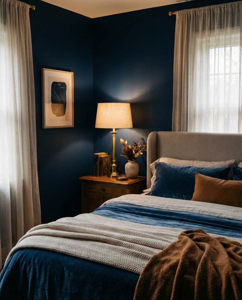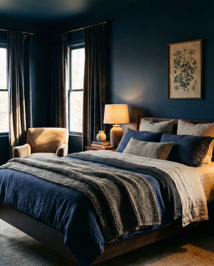 This idea embraces Moody energy using rich Blue tones layered with soft lighting and tactile materials. It’s one of those Ideas aesthetic choices that feels bold yet comforting, especially for women who enjoy depth and introspection. I’ve noticed designers like Emily Henderson recommend darker palettes when balanced with warmth, and this style does just that. Velvet accents, matte finishes, and intentional paint ideas create intimacy without heaviness. These woman bedrooms often feel like a personal retreat after long days, proving that darker color schemes can still feel welcoming and expressive.