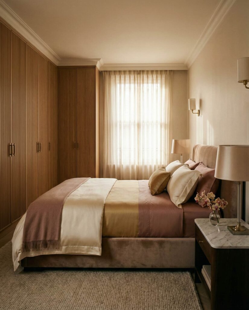 This idea proves that designs small room luxury are absolutely achievable with the right focus. Instead of filling space, this style emphasizes intentional design, custom wardrobe design, and reflective surfaces to visually expand the room. Inspired by boutique hotel rooms, it’s a favorite among women living in urban apartments. Rich textures, tailored bedding, and layered lighting transform limited square footage into something indulgent. Many designers at Architectural Digest highlight this approach as a smart way to invest in quality over quantity, making the bedroom feel elevated regardless of size.