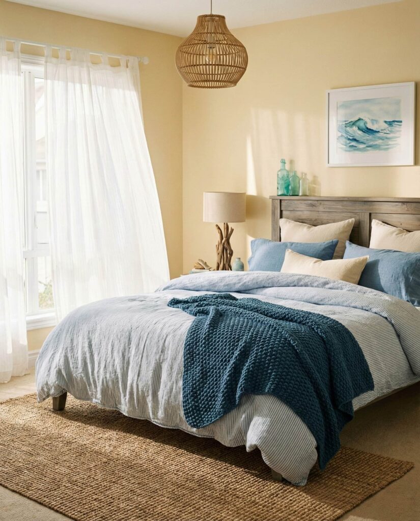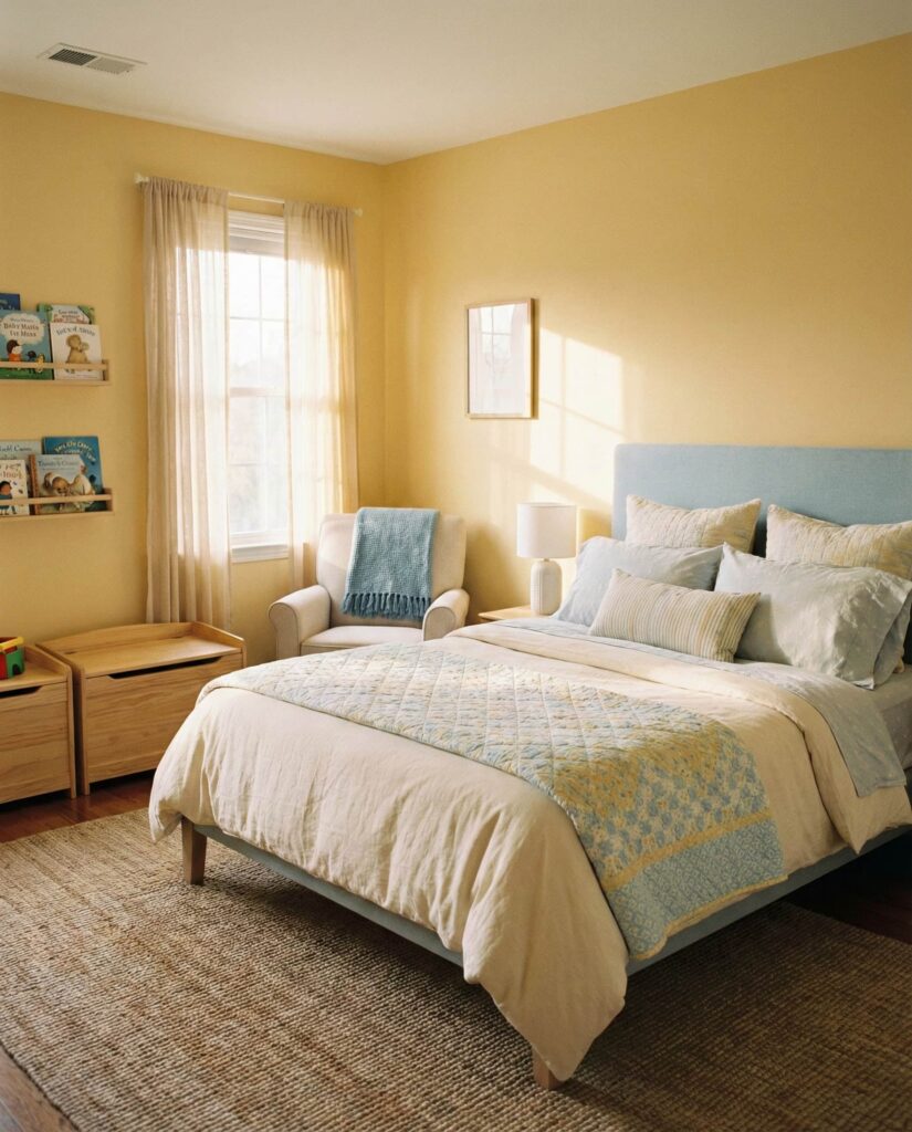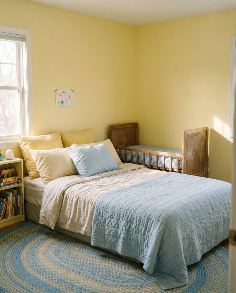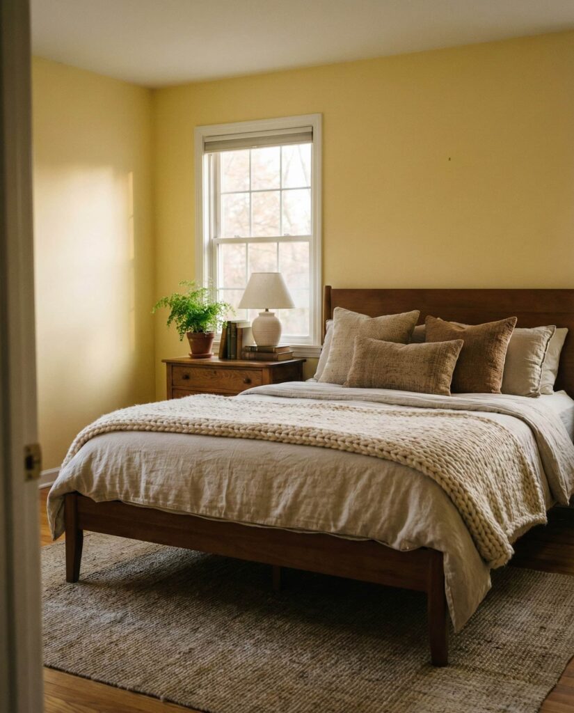 Butter yellow bedrooms feel instantly comforting, especially when combined with Brown and natural wood tones. This idea works beautifully for adults who want warmth without visual heaviness. I’ve seen designers on House Beautiful use butter yellow on Walls or bedding, then layer walnut nightstands or oak floors to ground the space. The result feels approachable and timeless rather than trendy. This palette is especially effective in suburban homes where natural light enhances yellow’s softness, creating a bedroom that feels lived-in, calm, and quietly inviting rather than styled for show.