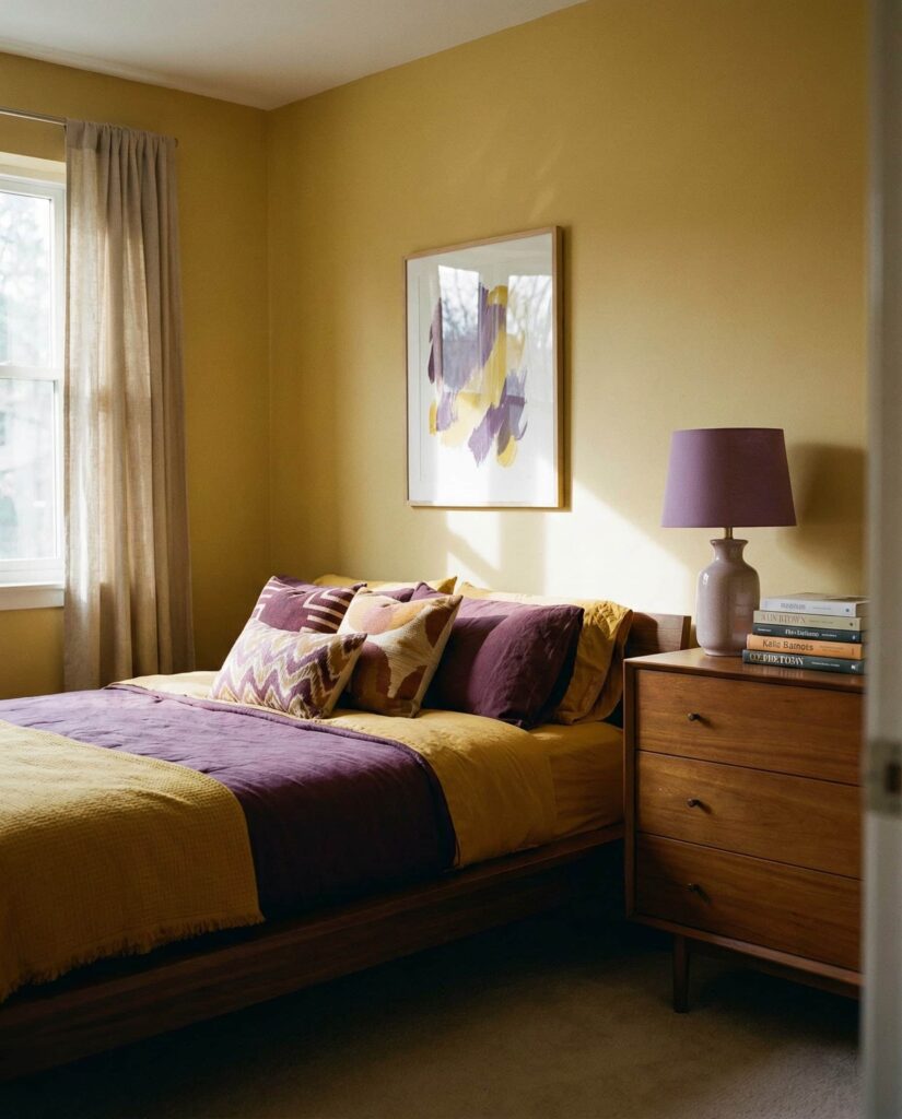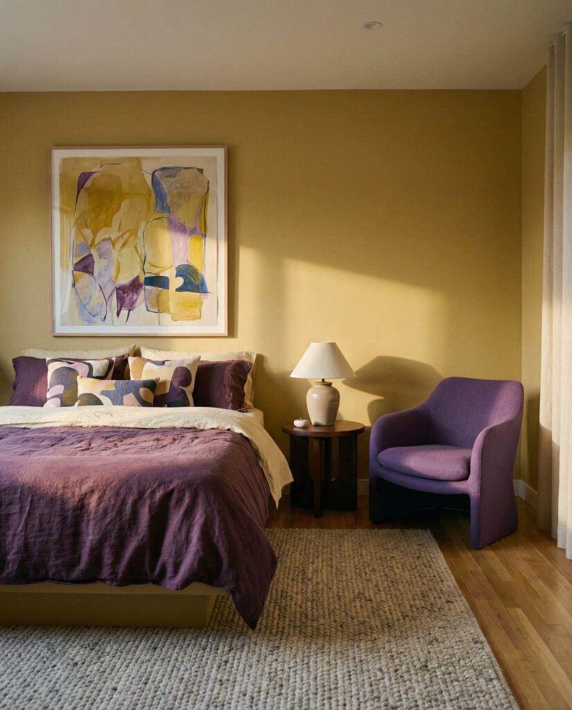 A Purple and yellow bedroom offers a confident, artistic contrast that feels fresh when done with restraint. Designers often suggest muted lavender or aubergine tones paired with softer yellow to avoid overpowering the room. This idea works well for teens or creative adults who want a space that reflects personality. I’ve noticed this palette appearing more often in editorial shoots as an alternative to predictable neutrals. Used thoughtfully, it feels expressive yet livable, especially when anchored with neutral flooring or simple furniture silhouettes.