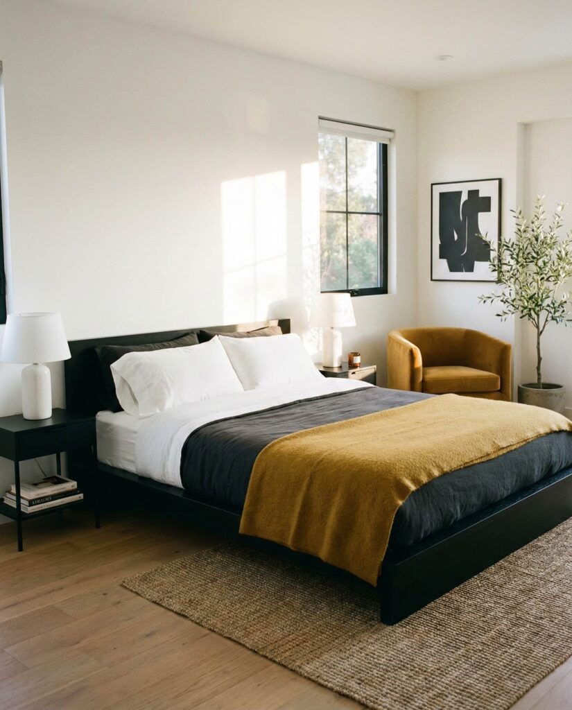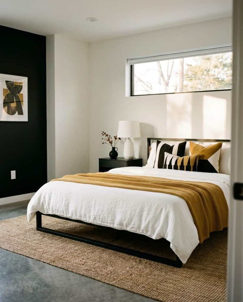 A Black and white and mustard bedroom feels editorial and polished, perfect for adults who enjoy structured design. I’ve seen this combination used effectively in apartments where clean lines matter. White creates clarity, black adds definition, and mustard injects warmth. According to Dezeen interiors features, this trio works best when patterns are minimal and materials feel intentional. The look is modern, confident, and surprisingly cozy when layered with textiles like wool or cotton rather than glossy finishes.
