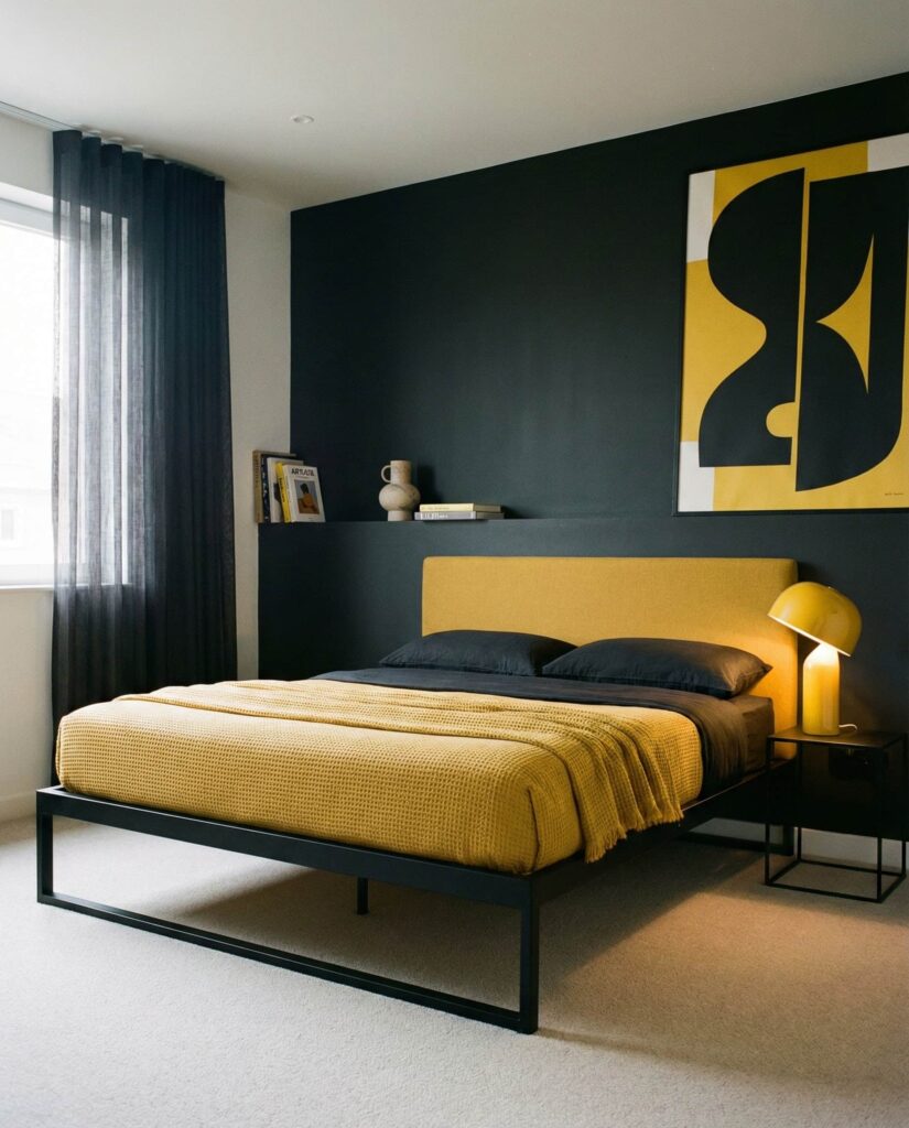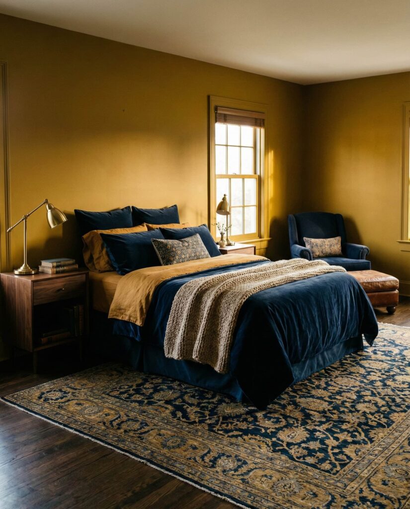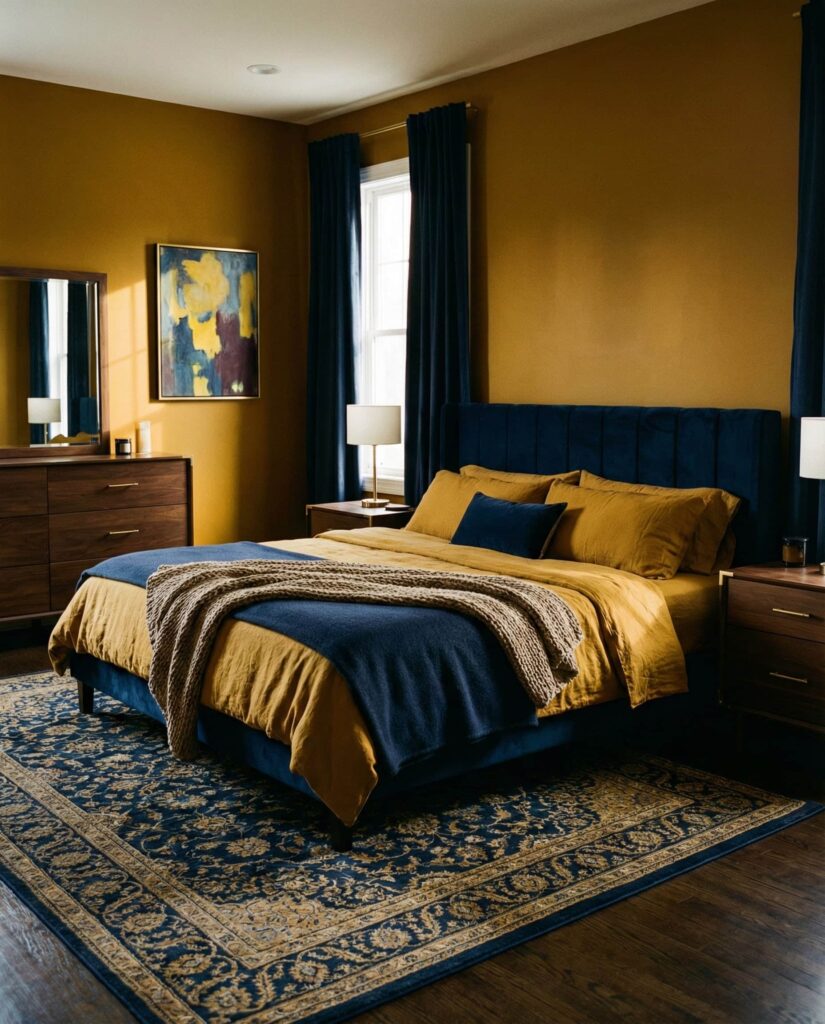 A Dark yellow bedroom paired with Navy blue feels dramatic yet grounded. This idea suits larger bedrooms or a bold master suite where depth adds intimacy. Designers often recommend using navy on accent walls or upholstered pieces while allowing yellow to dominate through textiles or paint. I’ve noticed this palette works especially well in homes with traditional architecture, lending richness without feeling heavy. The result feels confident, grown-up, and intentionally moody.