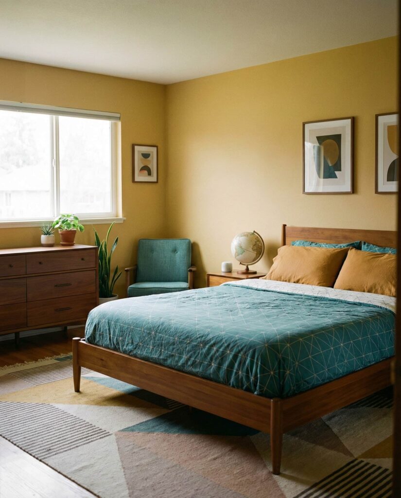 A Teal and yellow bedroom nods to mid-century design while still feeling current. This palette works well for adults who appreciate retro influence without committing fully to vintage decor. I’ve seen this idea succeed when paired with low-profile furniture, geometric patterns, and warm woods. Yellow brightens teal’s depth, creating balance rather than competition. It’s a smart choice for homeowners who enjoy color but want a cohesive, design-forward look.