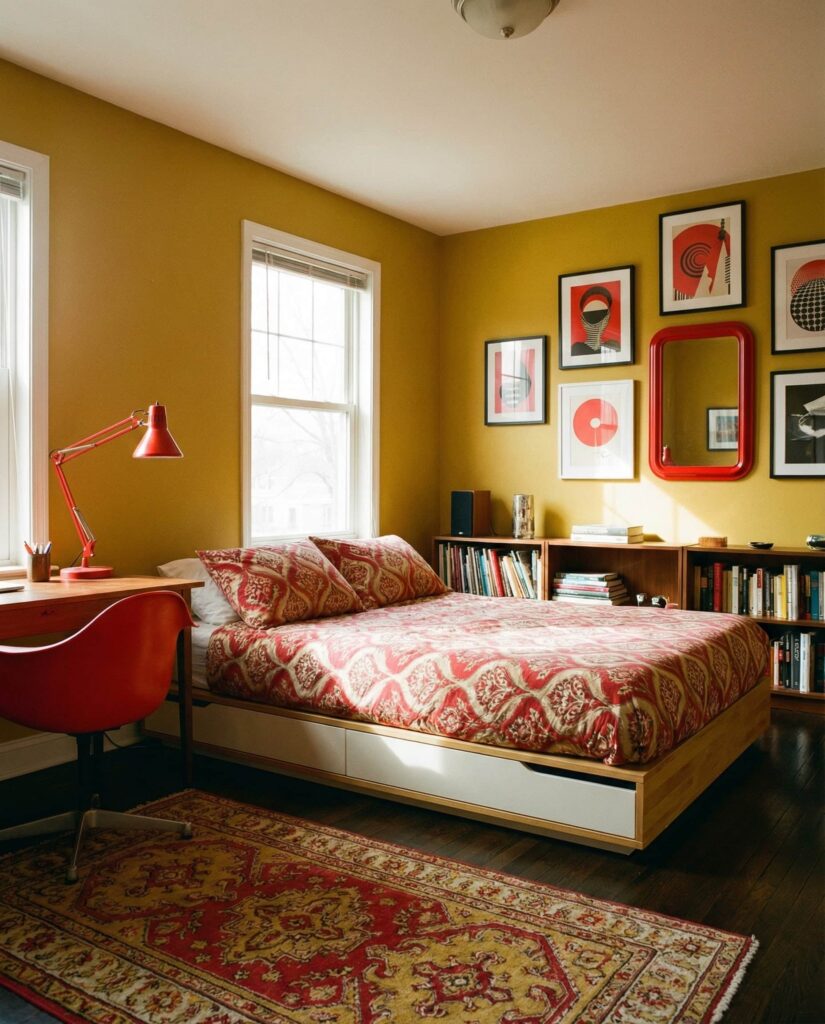 A Red and yellow bedroom feels bold and energizing, best suited for teens or creative personalities. Designers caution against overuse, suggesting red appear in artwork or textiles while yellow remains the primary color. I’ve noticed this approach works well in rooms that double as study or hobby spaces, where stimulation feels appropriate. When balanced correctly, the palette feels intentional rather than chaotic, offering vibrancy without sacrificing comfort.