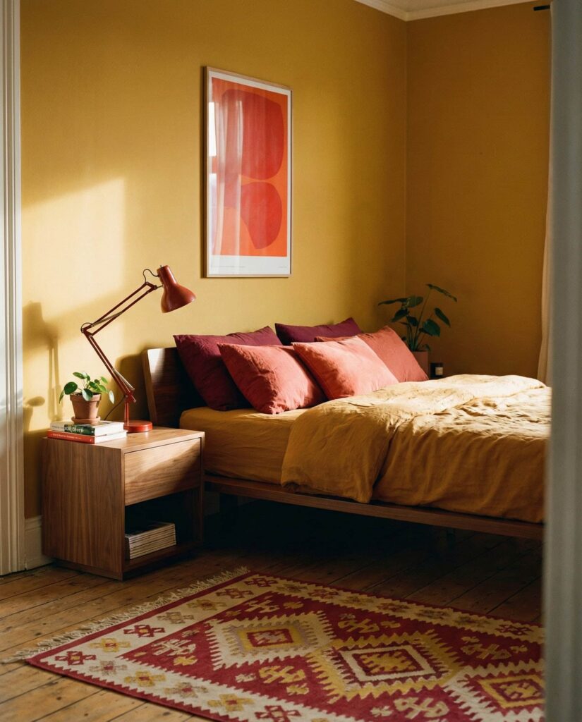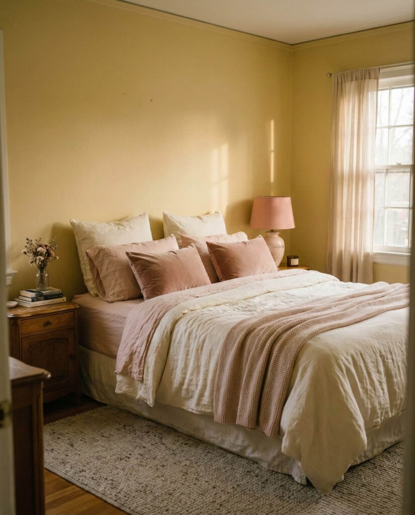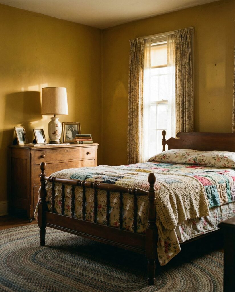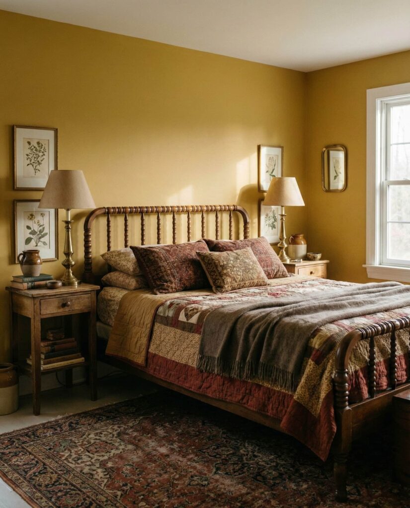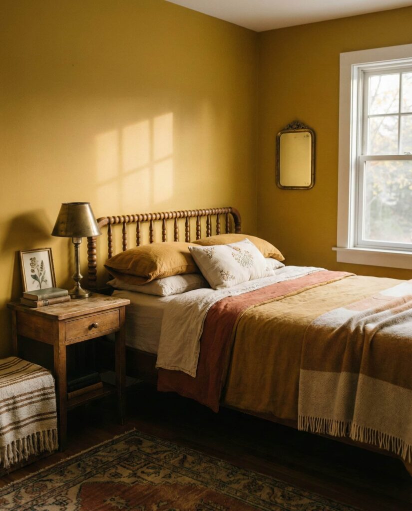 Mustard yellow continues to dominate bedrooms inspired by Vintage aesthetics. This deeper tone feels rich and intentional, especially when layered with antique wood furniture, brass details, and textured fabrics. I’ve personally noticed that mustard reads warmer in low light, making it perfect for cozy bedrooms for adults or a character-filled guest room. Editors at Apartment Therapy often highlight mustard as a bridge between modern and nostalgic design. Used thoughtfully, it feels collected rather than trendy, particularly when paired with aged leather or woven rugs that add depth.