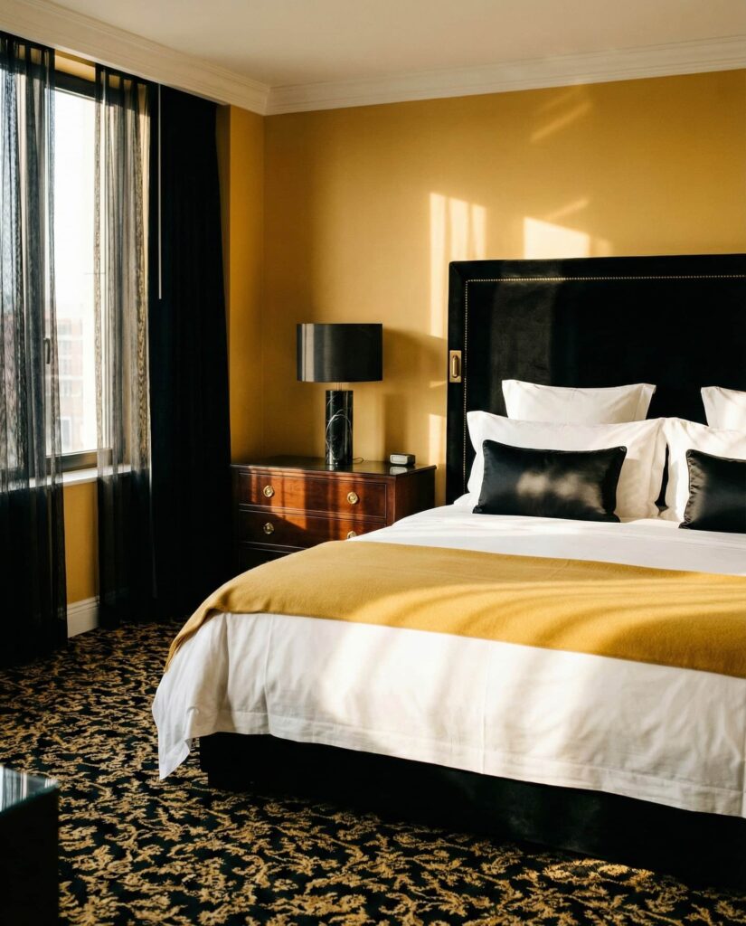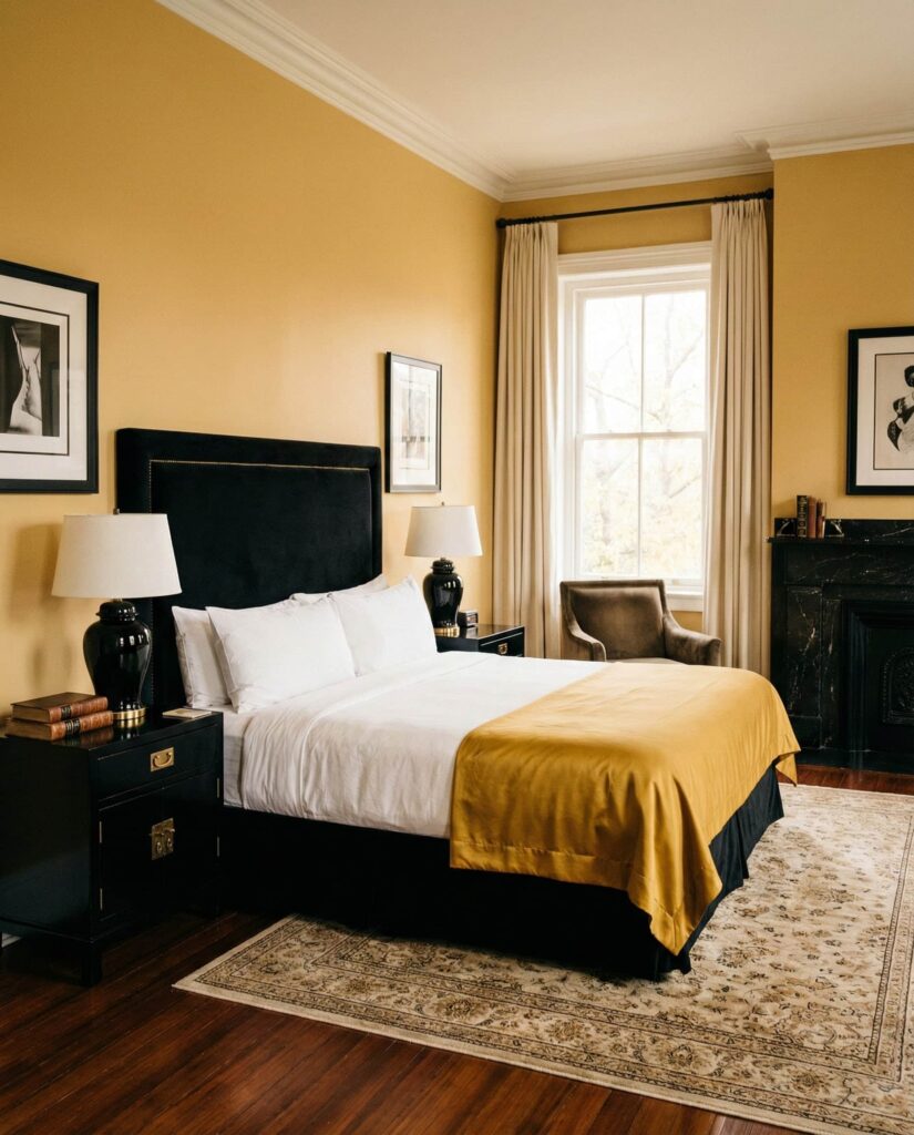 A yellow bedroom styled for luxury often relies on contrast, especially with Black and accents. This idea suits a refined master bedroom where materials matter. I’ve seen designers use velvet, marble, or matte metals to elevate yellow beyond casual cheerfulness. The palette feels bold but controlled, offering hotel-like confidence without losing warmth or comfort.