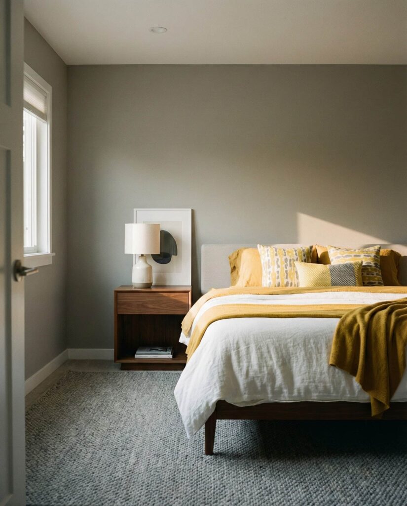 Pairing Gray and yellow creates one of the most adaptable palettes for contemporary bedrooms. Designers often recommend this combination for adults who want color without losing sophistication. In practice, gray grounds the space while yellow adds energy, whether through bedding, accent chairs, or artwork. I’ve seen this work especially well in urban apartments where concrete or neutral flooring dominates. According to Houzz contributors, the key is contrast control: softer gray walls with sharper yellow accents prevent the room from feeling cold. This idea suits minimalist tastes while still feeling inviting, making it ideal for everyday living rather than showroom styling.
