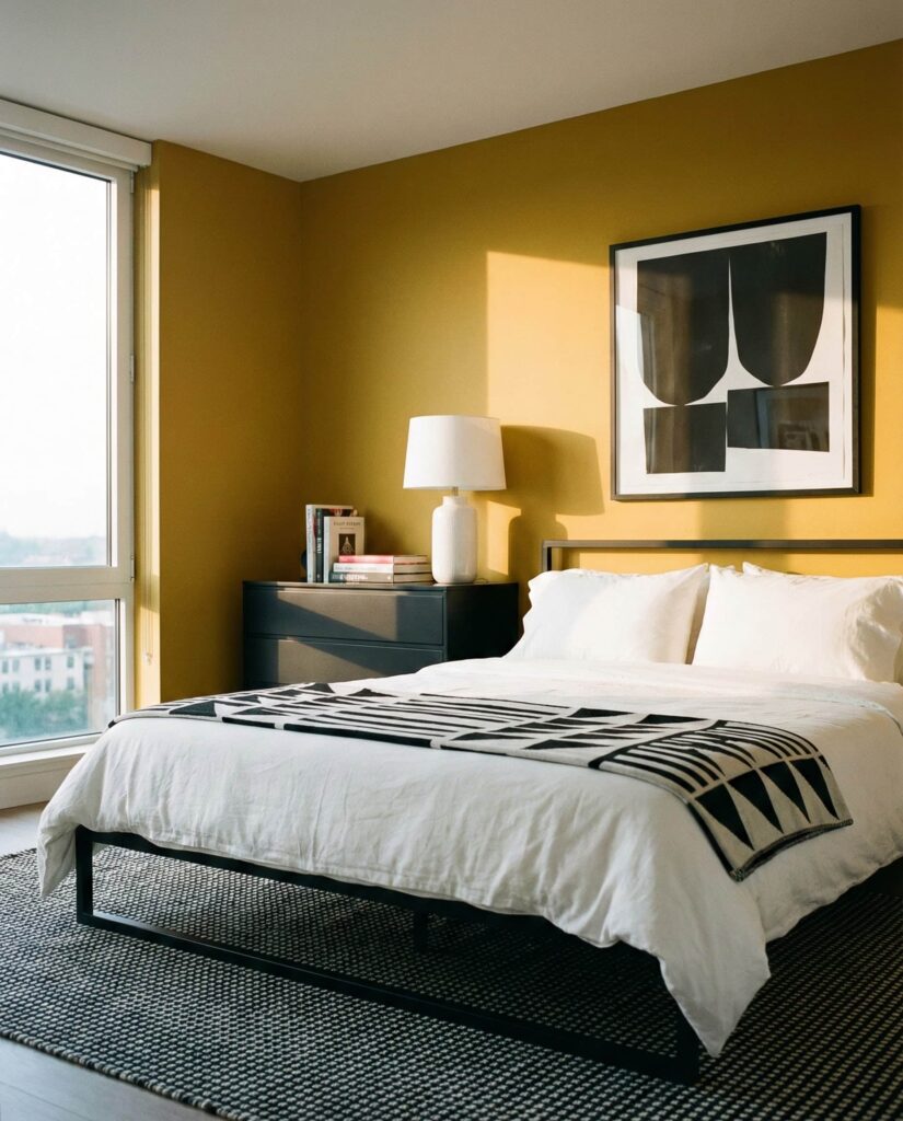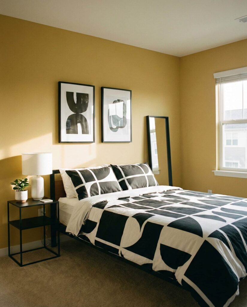 Yellow bedrooms built around bold Walls gain a modern edge when paired with Black and white graphic elements. This idea works especially well for adults who want something expressive yet structured, and it translates easily into a stylish master bedroom. I’ve noticed designers at Dwell and Interior Design Magazine using yellow walls as a confident backdrop, then layering black-framed art, white bedding, and clean-lined furniture to create rhythm. The contrast keeps yellow from feeling overly sweet, while the palette feels intentional rather than playful. It’s a smart option for urban homes or renovated spaces where architecture already provides character, allowing color to amplify the design instead of dominating it.