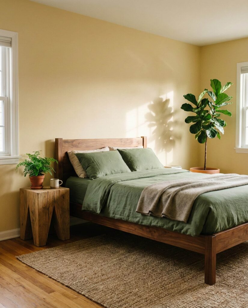 A Green and yellow bedroom aligns naturally with an Aesthetic focused on sustainability and calm living. This idea works well for adults interested in mindful interiors. Designers often pair yellow with sage or olive tones, natural fabrics, and simple forms. I’ve noticed this palette feels especially grounding in urban homes, where a connection to nature is welcome. The result is subtle, fresh, and emotionally restorative.