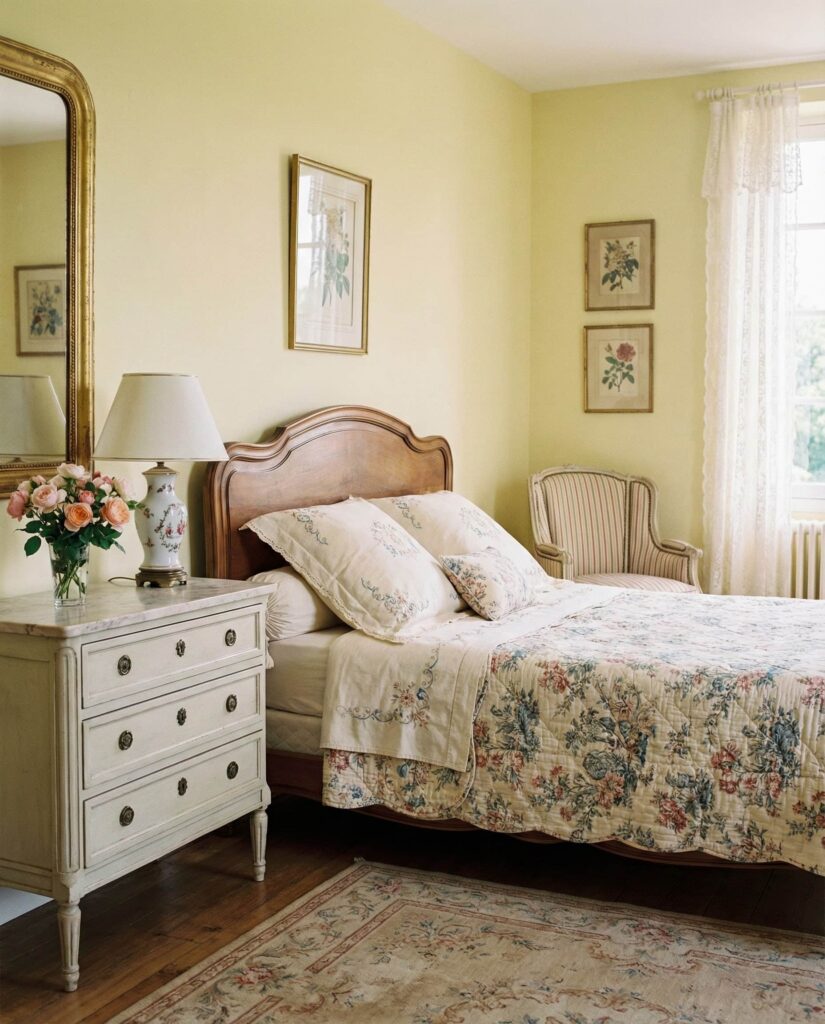 A French country pastel yellow bedroom blends romance with restraint. This style often includes soft Walls, curved furniture, and subtle patterns that feel lived-in rather than staged. I’ve seen this work beautifully for adults who appreciate classic European charm. Designers often pair yellow with gentle neutrals and antique-inspired details, creating a room that feels warm, welcoming, and quietly refined.