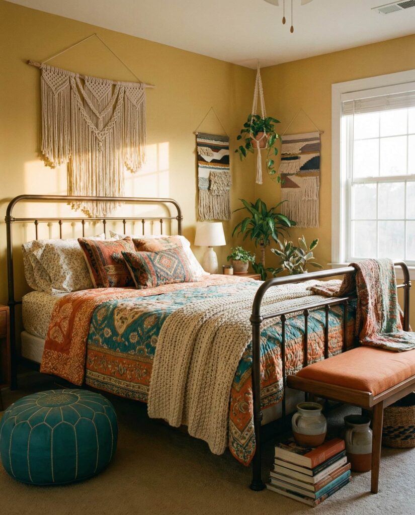 A Boho yellow bedroom thrives on layered color, especially when paired with Teal and Orange and accents. This idea feels expressive and personal, perfect for teens or creative homeowners. I’ve noticed boho spaces succeed when yellow acts as the anchor rather than competing with other hues. Textiles, art, and handcrafted decor bring the room together, resulting in a relaxed, soulful environment.